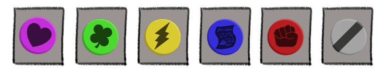 If using The Theatre Suit Die the color and symbol will correspond directly with what is on the cards. If using a 6 sided die, you can use the following table instead:
